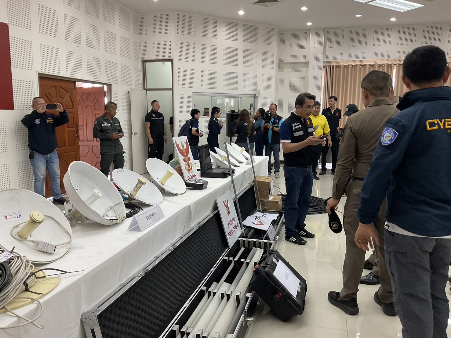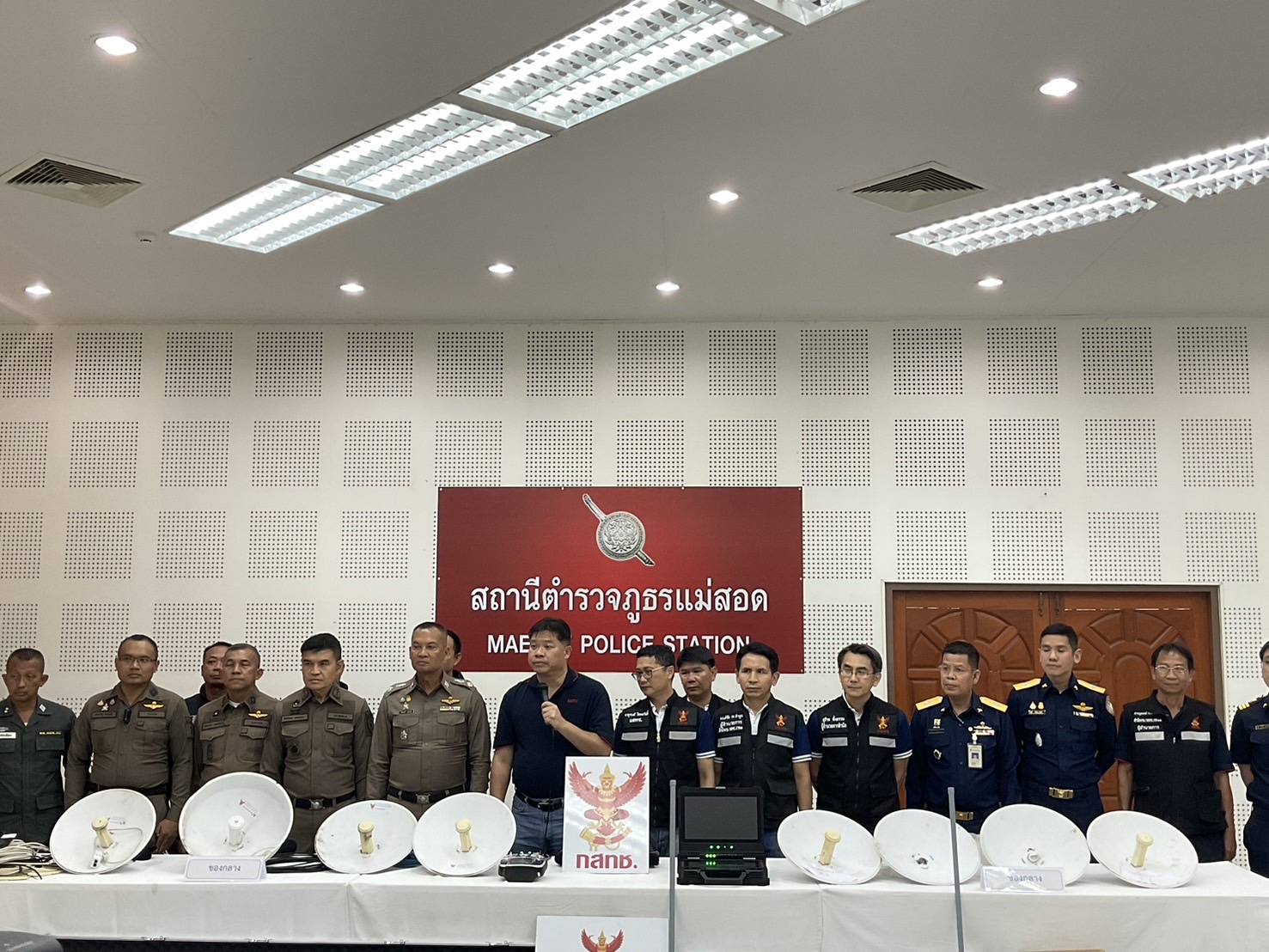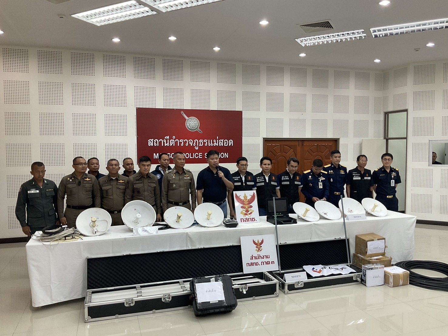 วันนี้ 28 มิ.ย.67 กสทช.ร่วมกับตำรวจภูธรจังหวัดตาก แถลงข่าวกวาดล้างเสาสัญญานเน็ตผิดกฏหมาย ณ สภ.แม่สอด นายไตรรัตน์ วิริยะศิริกุล รองเลขาธิการ รักษาการแทน เลขาธิการ กสทช. , พล.ต.ต.สัมฤทธิ์ เอมกมล ผบก.ภ.จว.ตาก และพล.ต.ต.จิตติพนธ์ ผลพฤกษา ผบก.สอท.4 พร้อมด้วยเจ้าหน้าที่ตำรวจ กก.2 บก.สอท.4 พร้อมส่วนที่เกี่ยวข้อง เบื้องต้นได้ตรวจค้นในพื้นที่แม่สอด จำนวน 5 จุด