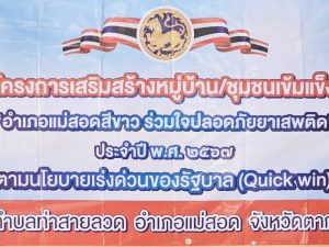วันนี้ (20 ก.พ.2567) เวลาประมาณ 09.00 น. ภายใต้การอำนวยการสั่งการของ พ.ต.อ.พิทยากร เพชรรัตน์ ผกก.สภ.แม่สอด พ.ต.ท.จักรพันธ์ แก้วมณี รอง ผกก.ป.สภ.แม่สอด พ.ต.ท.ศุภกิจ ศรีไพร สวป.สภ.แม่สอด มอบหมายให้ ร.ต.ท.สำเภา อยู่ทอง รอง สว.(ป.)สภ.แม่สอด พร้อมด้วยสายตรวจตำบลท่าสายลวด(ตู้ 407) ร่วมกับเจ้าหน้าที่ชุดปฏิบัติการตำบล/หมู่บ้าน(ทีม 8 เกลอ)ประจำตำบลท่าสายลวด ตามคำสั่งศูนย์ปฏิบัติการป้องกันและปราบปรามยาเสพติดอำเภอแม่สอด ที่ 7/2567 ประกอบด้วย อำเภอแม่สอด,สถานีตำรวจภูธรแม่สอด,หน่วยเฉพาะกิจราชมนู, สสอ.แม่สอด, รพ.สต.บ้านวังตะเคียน, ทต.ท่าสายลวด, อบต.ท่าสายลวด, และกำนันผู้ใหญ่บ้านตำบลท่าสายลวด ร่วมพิธีเปิดโครงการเสริมสร้างหมู่บ้าน/ชุมชนเข็มแข็ง “อำเภอแม่สอดสีขาว ร่วมใจปล่อยภัยยาเสพติด” ประจำปี พ.ศ.2567 ตามนโยบายเร่งด่วนของรัฐ (Quick win) พร้อมกันนี้ยังได้จัดเจ้าหน้าที่สายตรวจตำบลท่าสายลวด(ตู้ 407) ร่วมกับเจ้าหน้าที่ทหาร ฉก.ราชมนู ถ่ายทอดการฝึกระเบียบแถวชิดแบบบุคคลท่ามือเปล่า ให้กับผู้เข้ารับการอบรมได้ฝึกอีกด้วย โดยมี นางชญาภา สุบรรณพงษ์ ปลัดอำเภอแม่สอด เป็นประธานในพิธี