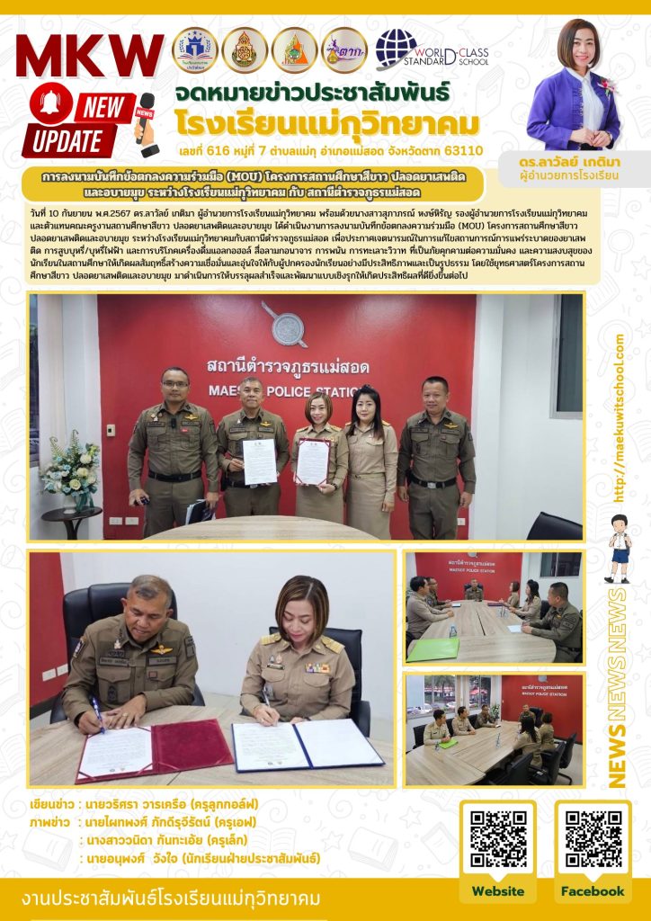 วันที่ 10 กันยายน พ.ศ.2567 ดร.ลาวัลย์ เกติมา ผู้อำนวยการโรงเรียนแม่กุวิทยาคม พร้อมด้วยนางสาวสุภาภรณ์ หงษ์หิรัญ รองผู้อำนวยการโรงเรียนแม่กุวิทยาคม และตัวแทนคณะครูงานสถานศึกษาสีขาว ปลอดยาเสพติดและอบายมุข ได้ดำเนินงานการลงนามบันทึกข้อตกลงความร่วมมือ (MOU) โครงการสถานศึกษาสีขาว ปลอดยาเสพติดและอบายมุข ระหว่างโรงเรียนแม่กุวิทยาคมกับสถานีตำรวจภูธรแม่สอด เพื่อประกาศเจตนารมณ์ในการแก้ไขสถานการณ์การแพร่ระบาดของยาเสพติด การสูบบุหรี่/บุหรี่ไฟฟ้า และการบริโภคเครื่องดื่มแอลกอฮอล์ สื่อลามกอนาจาร การพนัน การทะเลาะวิวาท ที่เป็นภัยคุกคามต่อความมั่นคง และความสงบสุขของนักเรียนในสถานศึกษาให้เกิดผลสัมฤทธิ์สร้างความเชื่อมั่นและอุ่นใจให้กับผู้ปกครองนักเรียนอย่างมีประสิทธิภาพและเป็นรูปธรรม โดยใช้ยุทธศาสตร์โครงการสถานศึกษาสีขาว ปลอดยาเสพติดและอบายมุข มาดำเนินการให้บรรลุผลสำเร็จและพัฒนาแบบเชิงรุกให้เกิดประสิทธิผลที่ดียิ่งขึ้นต่อไป