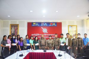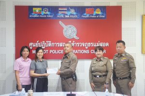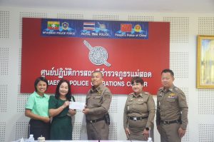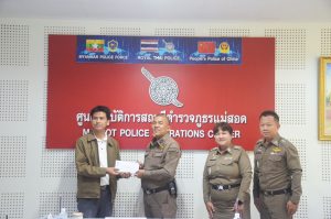 พ.ต.อ.พิทยากร เพชรรัตน์ ผกก.สภ.แม่สอด มอบหมายให้ พ.ต.ท.หญิง อรพิน อุปคำ สว.อก.สภ.แม่สอด พร้อมด้วย ร.ต.อ.หญิง จิราพร วงษ์แก้ว, ร.ต.อ.หญิง ชนชนก กัลยานิติกุล, ส.ต.ท.พิธิวัฒน์ เครือคำอ้าย ร่วมกิจกรรมทำบุญตักบาตร ข้าวสาร อาหารแห้ง ครบรอบ 8 ปี กิจกรรม Anniversary 8th Robinson Lifestyle Maesot ศูนย์การค้าโรบินสันไลฟ์สไตล์แม่สอด