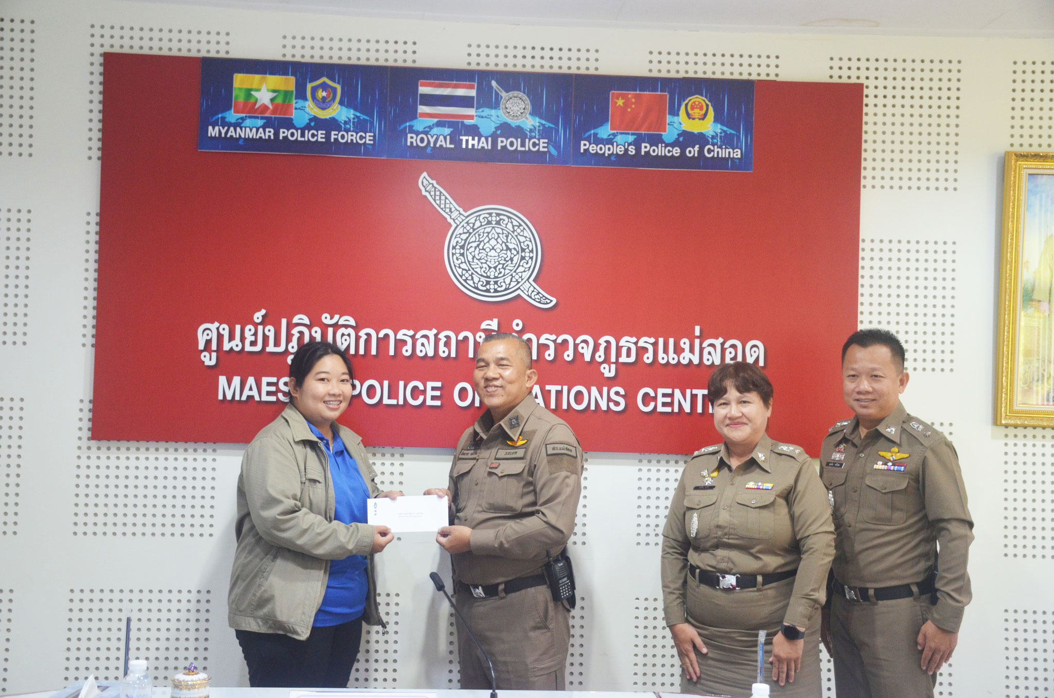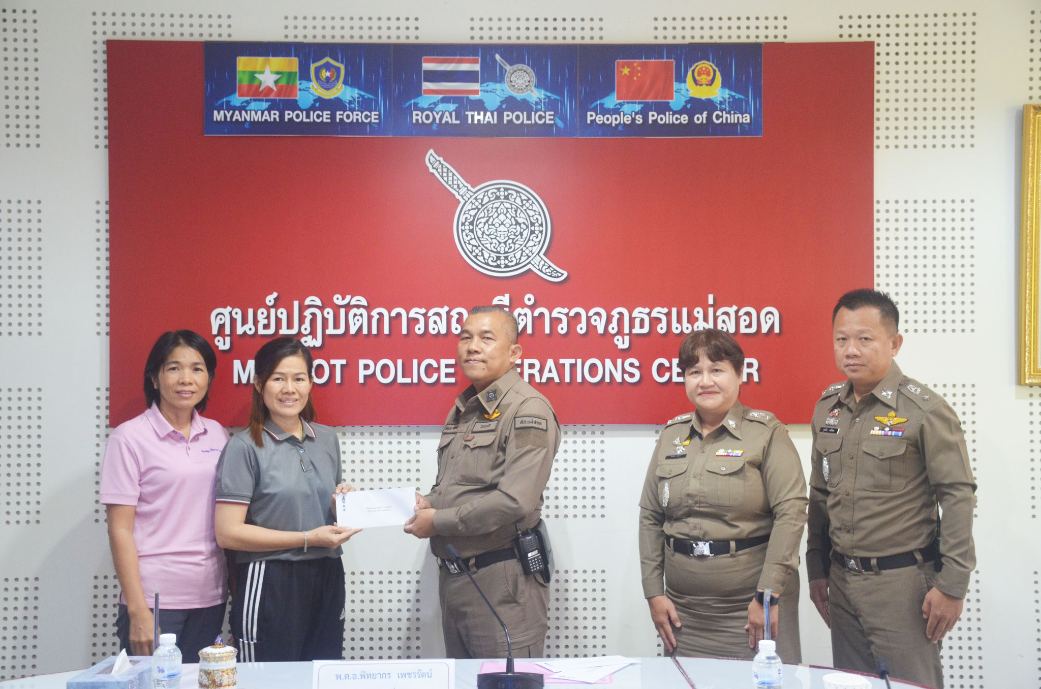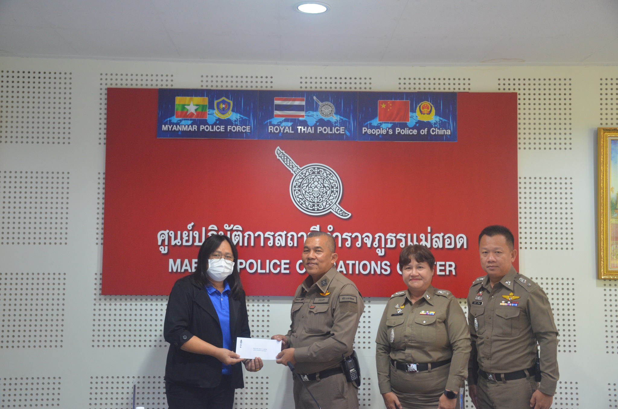 พ.ต.อ.พิทยากร เพชรรัตน์ ผกก.สภ.แม่สอด มอบหมายให้ พ.ต.ท.หญิง อรพิน อุปคำ สว.อก.สภ.แม่สอด พร้อมด้วย ร.ต.อ.หญิง จิราพร วงษ์แก้ว, ร.ต.อ.หญิง ชนชนก กัลยานิติกุล, ส.ต.ท.พิธิวัฒน์ เครือคำอ้าย ร่วมกิจกรรมทำบุญตักบาตร ข้าวสาร อาหารแห้ง ครบรอบ 8 ปี กิจกรรม Anniversary 8th Robinson Lifestyle Maesot ศูนย์การค้าโรบินสันไลฟ์สไตล์แม่สอด