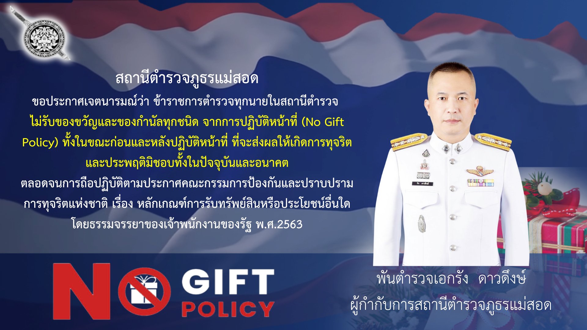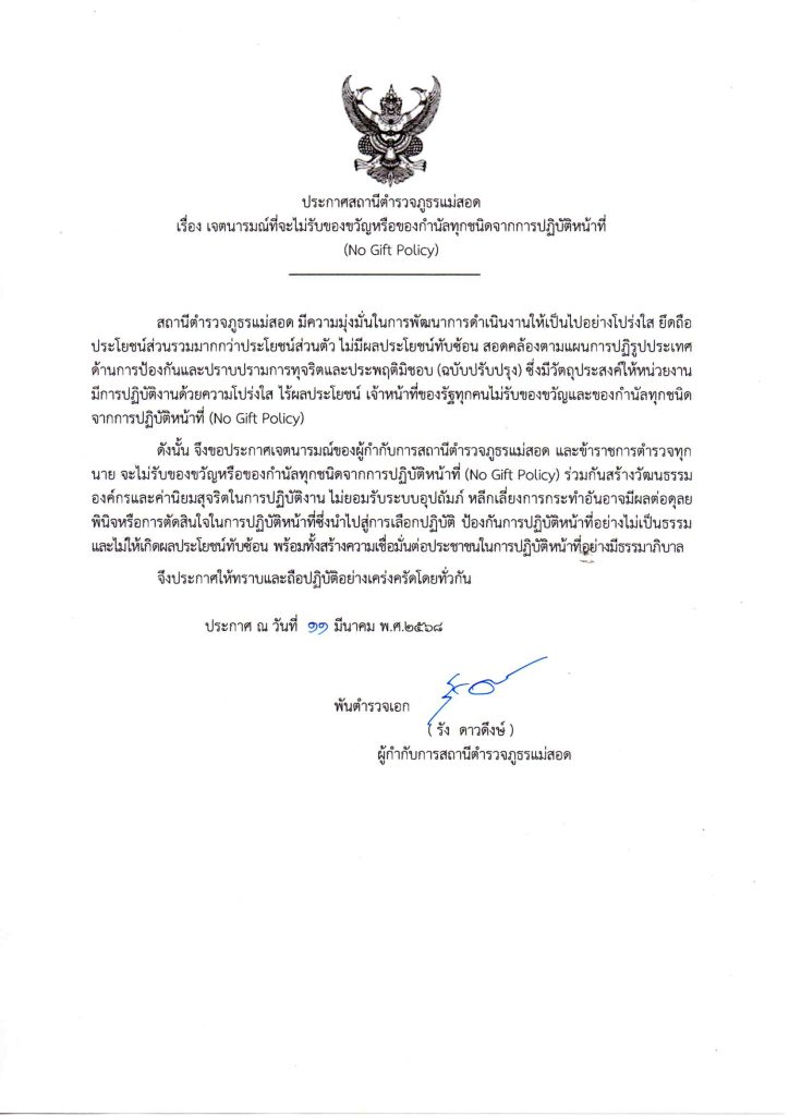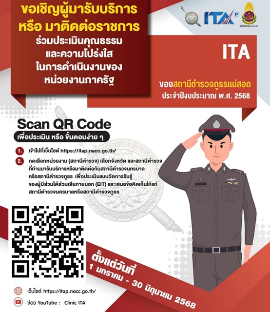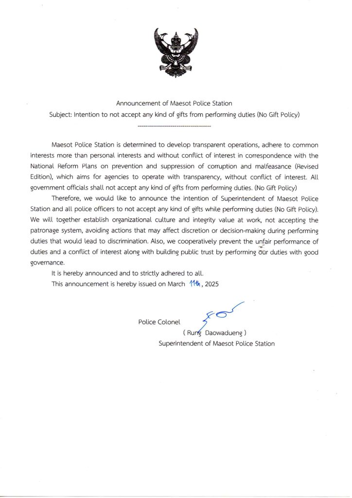 พันตำรวจเอกรัง ดาวดึงษ์ ผู้กำกับการสถานีตำรวจภูธรแม่สอด เป็นประธานการประชุมการประเมินคุณธรรมและความโปร่งใสในการดำเนินงานของ หน่วยงานภาครัฐ (ITA) ของสถานีตำรวจ ปี 2568 คณะทำงานขับเคลื่อนการประเมินคุณธรรมและความโปร่งใสฯ ทุกสายงานของสถานี ได้ทำการวิเคราะห์และประเมินความเสี่ยงต่อการรับสินบน